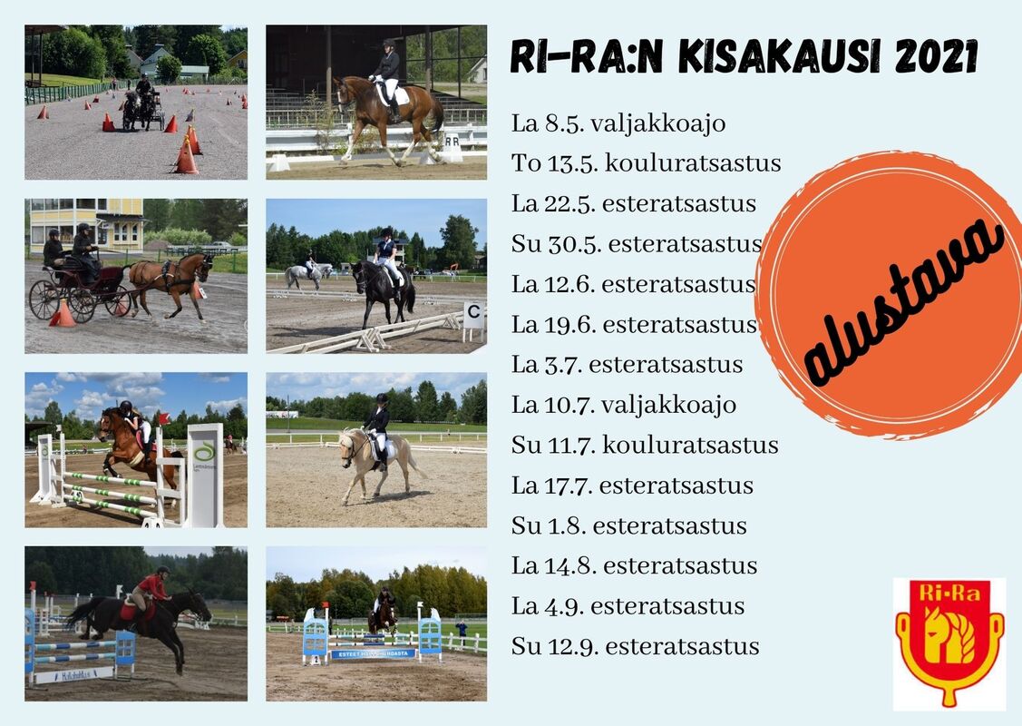 Ohessa pääsiäisen toivotuksemme ja päivitetty kisakalenteri, sekä LAP Cupin mainos. Raviradan siivoustalkoiden päivämäärä on päätetty! Jäsenemme saavat jäsenpostia pääsiäisen aikana. Kilpailukalenteriin ovat varmistuneet alustavat Lantmännen Agro Perttula Cupin päivämäärät. Ajankohtaisia päivämääriä toimihenkilökoulutuksista, sekä lisenssikoulutuksista löytyy täältä: https://tapahtumat.ratsastus.fi/tapahtumat/ ESRA järjestää vielä yhden KIPA/Equipe-koulutuksen huhtikuussa, joka myös löytyy oheisen linkin alta. Raviradalla on Riihimäen ratsastajat ry:n siivoustalkoot 25.4. klo 13:00 alkaen. |