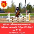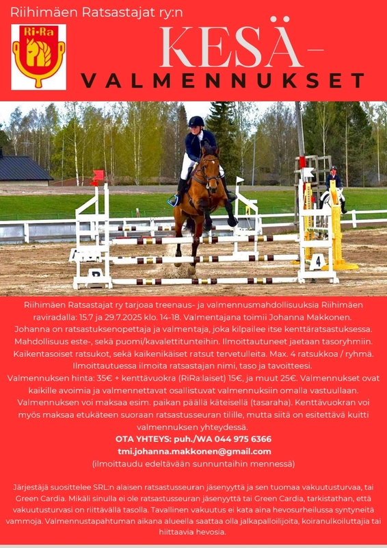 Tarjolla treenaus- ja valmennusmahdollisuuksia raviradalla 15.7 ja 29.7.2025 klo 14-18 Valmentajana toimii Johanna Makkonen, joka on ratsastuksenopettaja ja valmentaja, ja kilpailee itse kenttäratsastuksessa. Ri-Ra tarjoaa treenaus- ja valmennusmahdollisuuksia Riihimäen raviradalla 15.7 ja 29.7.2025 klo 14-18. Mahdollisuus este-, sekä puomi/kavalettitunteihin. Ilmoittautuneet jaetaan tasoryhmiin. Valmennuksen hinta: 35€ + kenttävuokra (RiRa:laiset) 15€, ja muut 25€. Valmennukset ovat kaikille avoimia ja valmennettavat osallistuvat valmennuksiin omalla vastuullaan. OTA YHTEYS: puh./WA 044 975 6366 Järjestäjä suosittelee SRL:n alaisen ratsastusseuran jäsenyyttä ja sen tuomaa vakuutusturvaa, tai Green Cardia. Mikäli sinulla ei ole ratsastusseuran jäsenyyttä tai Green Cardia, tarkistathan, että vakuutusturvasi on riittävällä tasolla. Tavallinen vakuutus ei kata aina hevosurheilussa syntyneitä vammoja. Valmennustapahtuman aikana alueella saattaa olla jalkapalloilijoita, koiranulkoiluttajia tai hiittaavia hevosia. Liitteet |