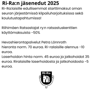 Yhteistyön puitteissa Ri-Ra:n jäsenet saavat mm. alennusta ostoistaan seuraavasti: -10% hevostarvikkeet (riimut, loimet jne) -5% rehut ja vitamiinit.