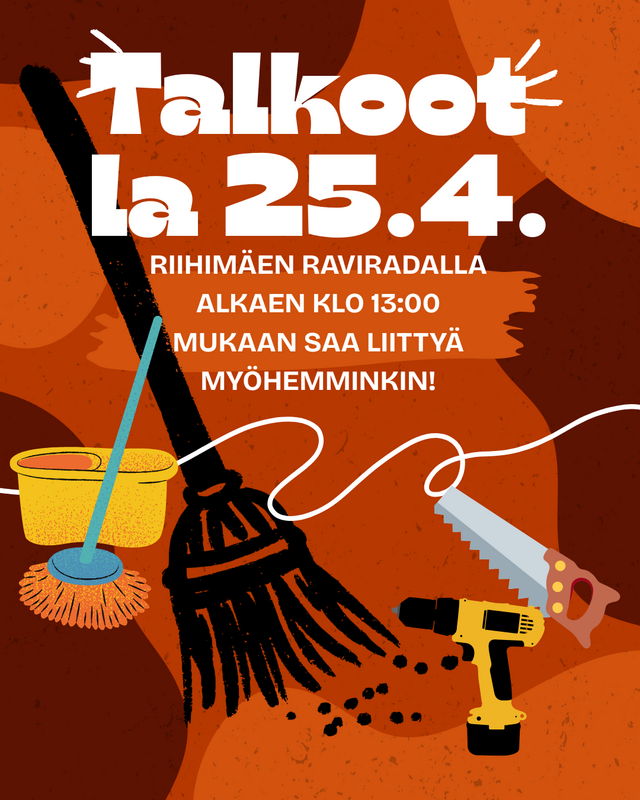 Aloitamme perinteiset kevättalkoot lauantaina 25.4. klo 13:00 Riihimäen raviradalla. Talkoolaiseksi voi a) tulla tupsahtaa b) ilmoittautua c) kysellä pääsyä keskenkin tapahtuman, että vieläkö apua tarvitaan - koska aina on joku kolkka jota puunata kesäkuntoon. Koska talvi on ollut pitkä ja jotkut paikat lumen painosta repsahtaneet, erityisellä kiitollisuudella otetaan vastaan myös sellaisia, joilla pysyy pora, ruuvit, sahat ja vastaavat hyppysissä. Jos on utelias ja tahtoo lisätietoa etukäteen, voi ottaa hallituslaisesta otteen hihasta ja kysyä, tai laittaa vaikka WA-viestiä seuran puhelinnumeroon. Tervetuloa! |